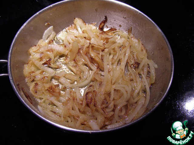 В это время режем лук и обжариваем и тушим его на медленном огне в оливковом масле и вине до золотого цвета и до карамелизации. По желанию можно добавить столовую ложку бренди или коньяка. Следить что бы лук не подгорел.