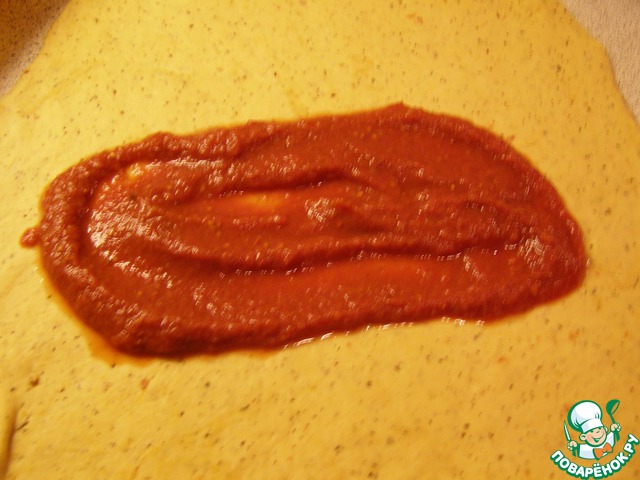 Половину лепешки промазываем сначала пастой томатной Pomito, так как там уже добавленны все специи.