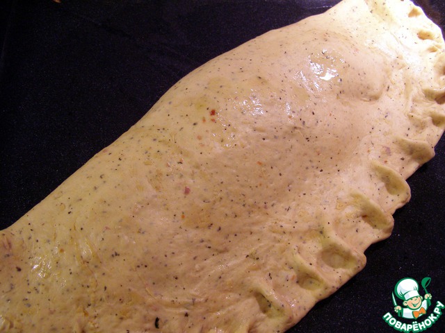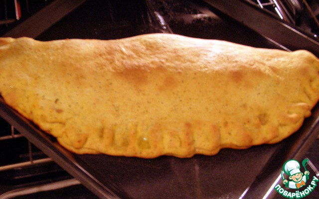 Закрываем и защипываем нашу panzerotti, смажем немного оливковым маслом сверху, тем что осталось от жарки лука. Обычно, после жарки лука с вином, на медленном огне, остаётся достаточно масла для смазки. И ставим в разогретую духовку на 15-20 минут, пока не подрумянится при 420 F это 200 -220 С