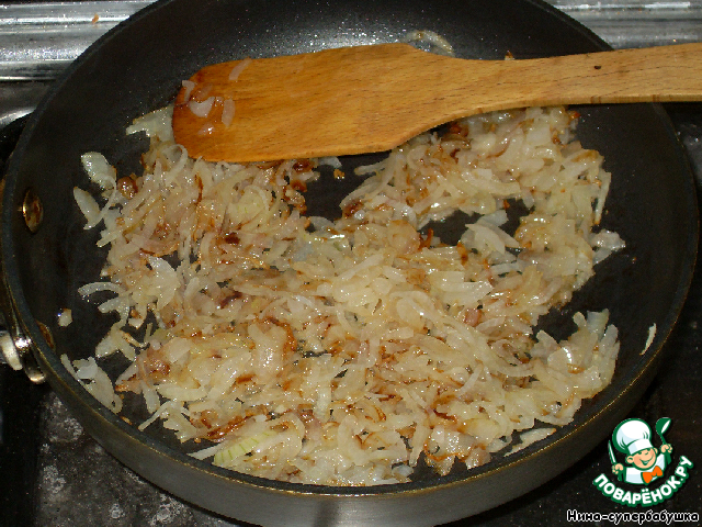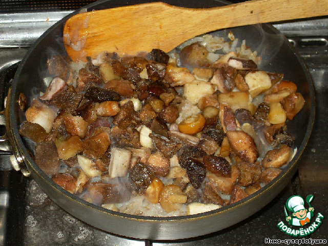 добавить грибы (у меня смесь лесных грибов, можно взять опята или шампиньоны, но лесные ароматнее), посолить, поперчить и жарить до испарения жидкости минут 10-15.