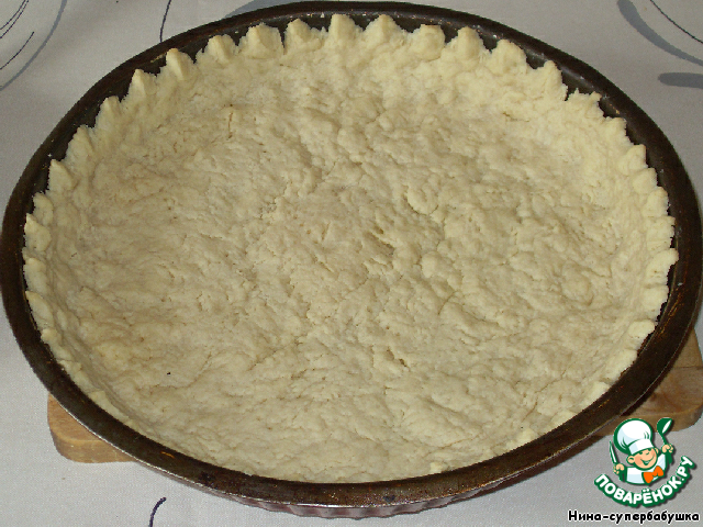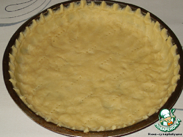 Тесто раскатать, выложить в форму, часто наколоть вилкой и выпекать в горячей духовке при 200*С 10 минут.