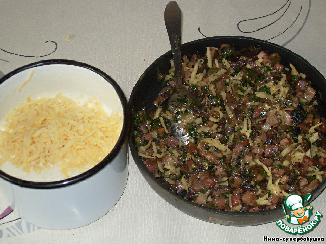 В конце добавить мелко нарезанную петрушку. Остудить и добавить половину натертого сыра. Перемешать.