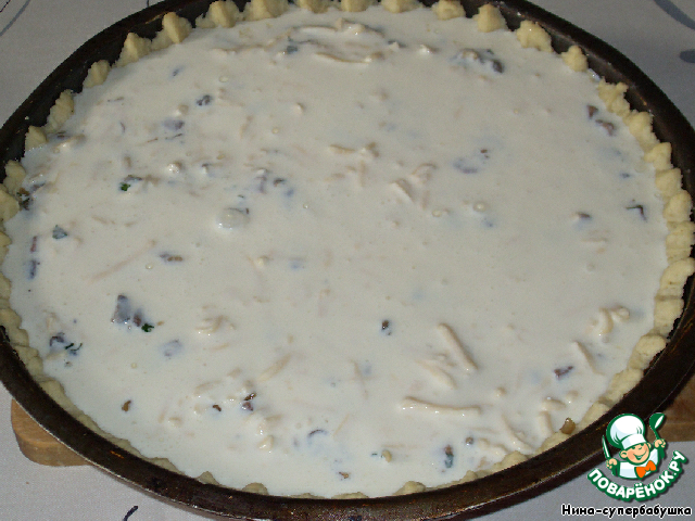 Равномерно залить пирог заливкой. Поставить в горячую духовку на 15 минут.