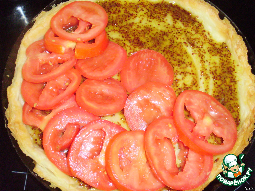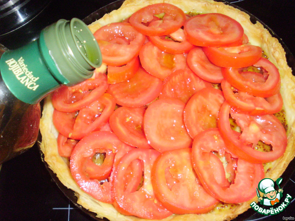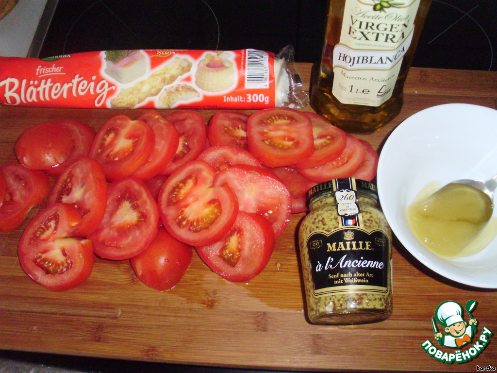 Основные продукты: помидоры, слоёное тесто, горчица, мёд, оливковое масло.