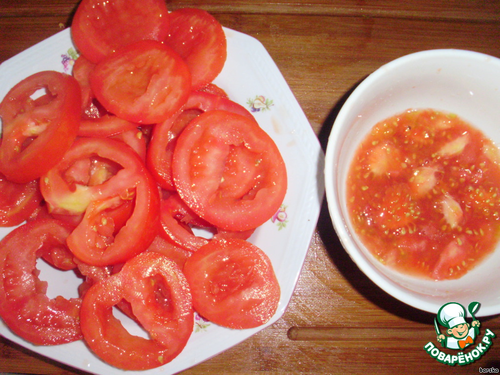 Помидоры нарезать дольками и освободить их от семечек и жидкости.