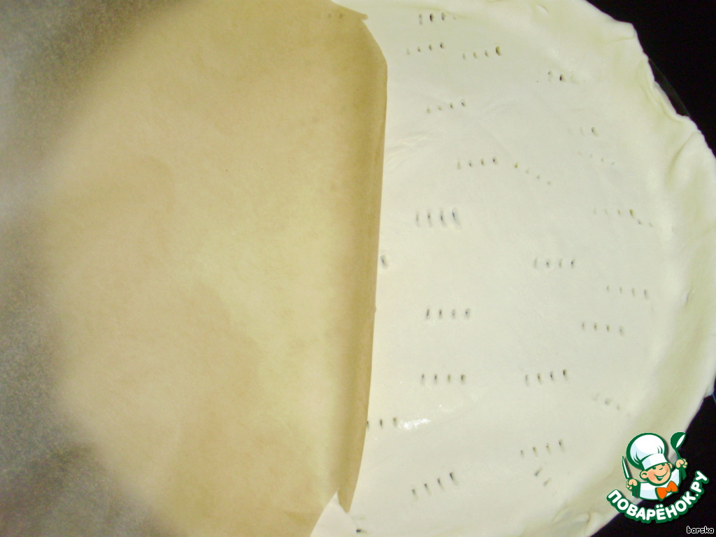 Слоёное тесто (если замороженное, то предварительно разморозить и ...) раскатать, выложить в смазанную маслом форму, обрезать края, наколоть вилкой, сверху выложить бумагу для выпечки с грузом (фасоль, горох...), отправить выпекаться в духовку, разогретую до 180°C на 15 минут.