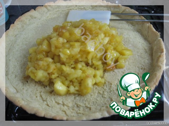 К этому времени корж подоспел, вынимаем с духовки, и первым слоем кладем яблочное пюре.