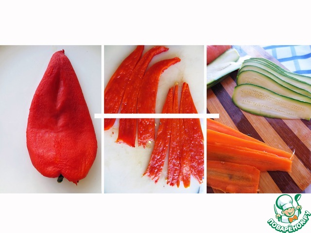 Разрезаем овощи в длину на тонкие пластины, слегка солим.