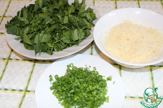 Готовлю начинку. Для этого нарезаю зеленый лук мелкими кольцами, рукколу - крупно (можно просто руками порвать), пармезан - на средней терке.