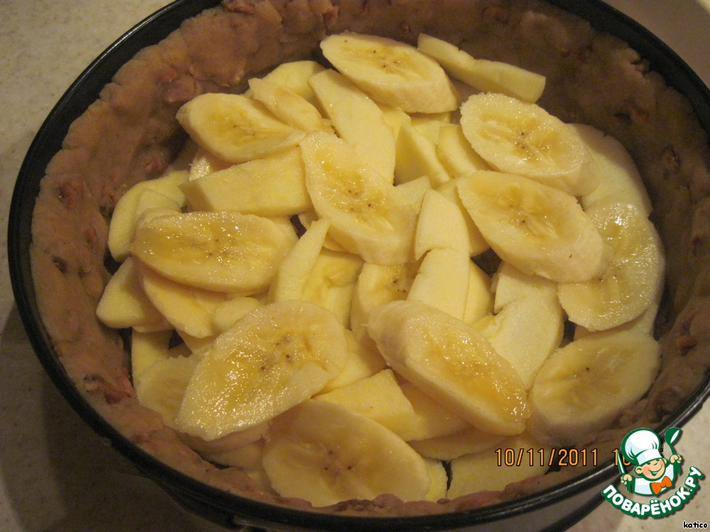 Яблоки очистить от сердцевины и кожуры, тонко порезать, выложить на тесто, банан очистить, тоже тонко порезать и выложить на яблоки. Поставить в предварительно разогретую духовку 180 град на 10-15 мин.