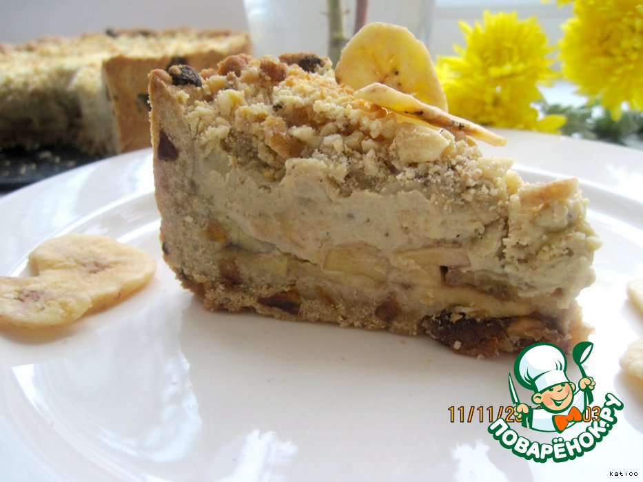 | Очень банановый пирог: песочный корж с ароматными вялеными бананами, прослойка из бананов и яблока, сверху - густой банановый крем, а еще выше - хрустящая посыпка из банановых чипсов и белого шоколада. Вкус очень банановый, нежный и насыщенный. Любители бананов, заходите! |