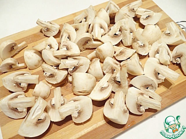 Пока варится киноа, мою шампиньоны и разрезаю на четыре части.