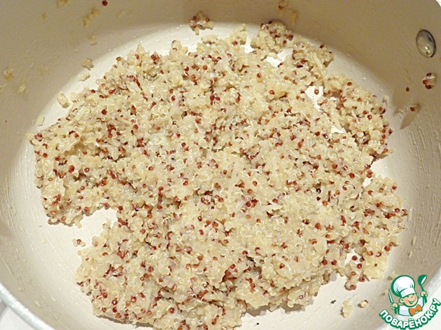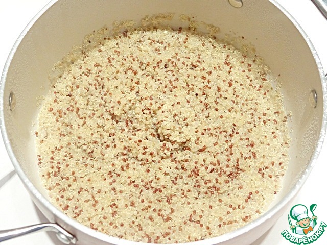 Для приготовления этого пирога я использую киноа ТМ "Мистраль". Крупу засыпаю в кастрюлю, заливаю водой, довожу до кипения, убавляю огонь. Готовлю при закрытой крышке, пока киноа не впитает в себя всю воду.
