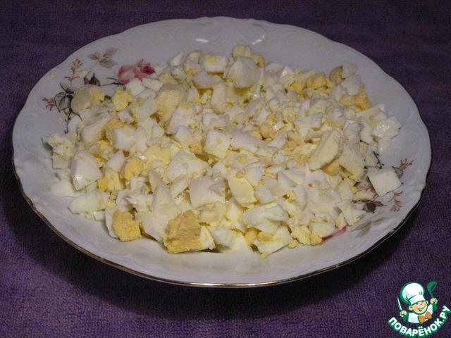 На яйца выложить оставшуюся часть риса, а сверху измельченные сухофрукты.
