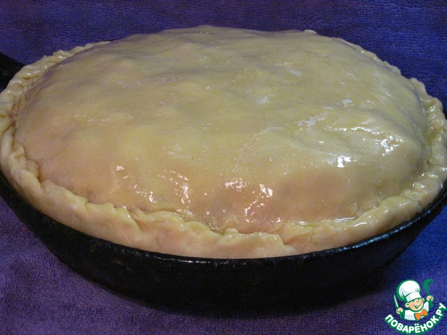 Оставшееся тесто раскатать в круг, положить на начинку. Края хорошо защипнуть. Сверху поверхность пирога смазать оставшимся маслом.