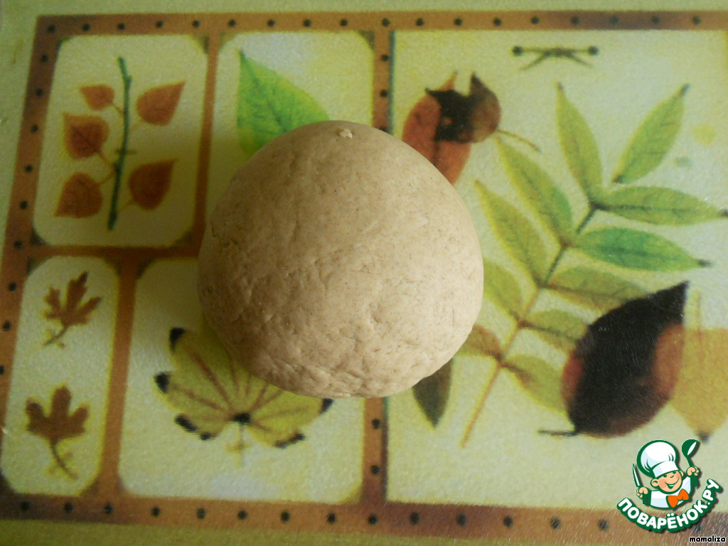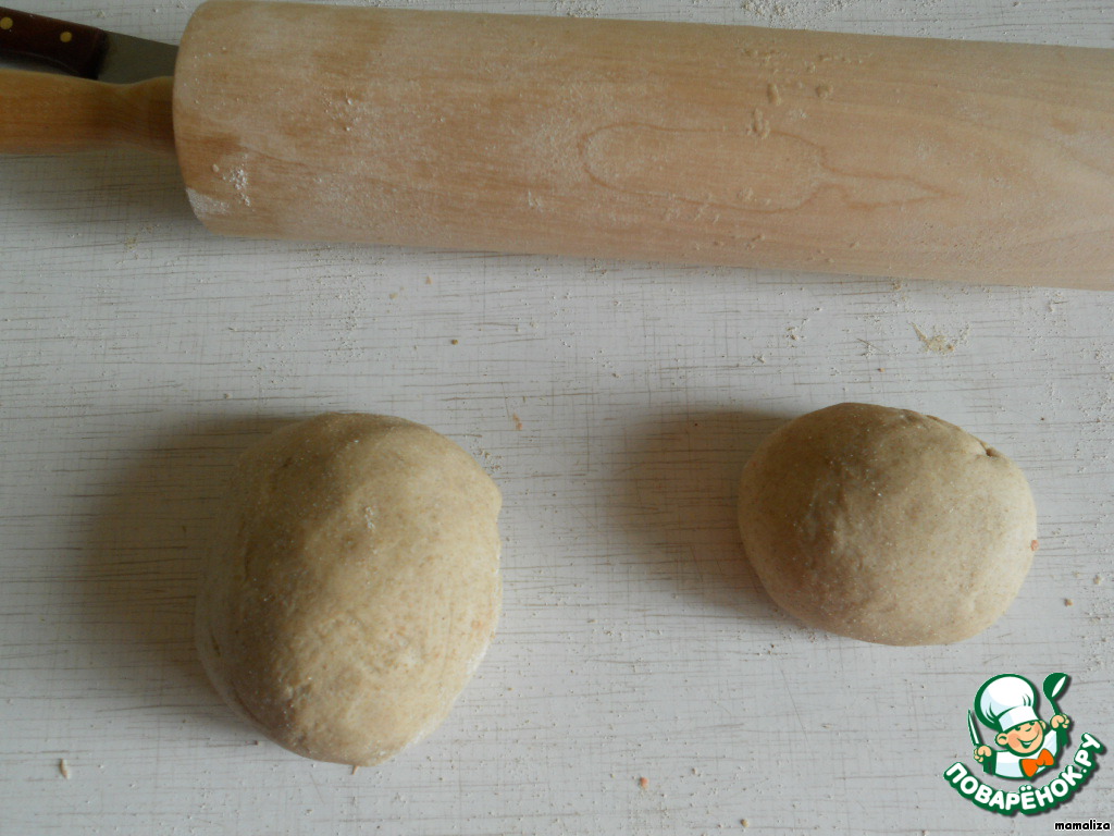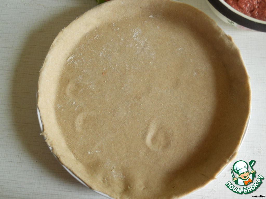 Достать тесто, разделить на 2 равные части. Одну половинку раскатать толщиной около 2 мм. В оригинале рецепта пирог формируется в форме бруска. У меня круглая керамическая форма, поэтому тесто я раскатала в виде круга.