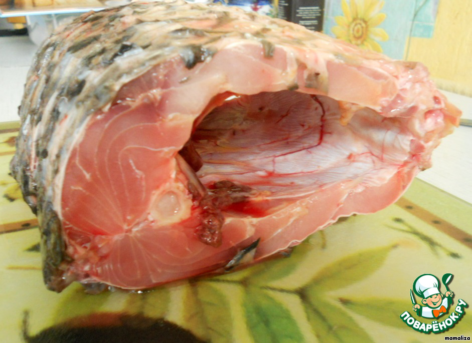 Вот такую рыбу принес мой муж с рынка. Это сазан. Но вполне подойдет щука, судак, лещ или другая мясистая речная рыба.