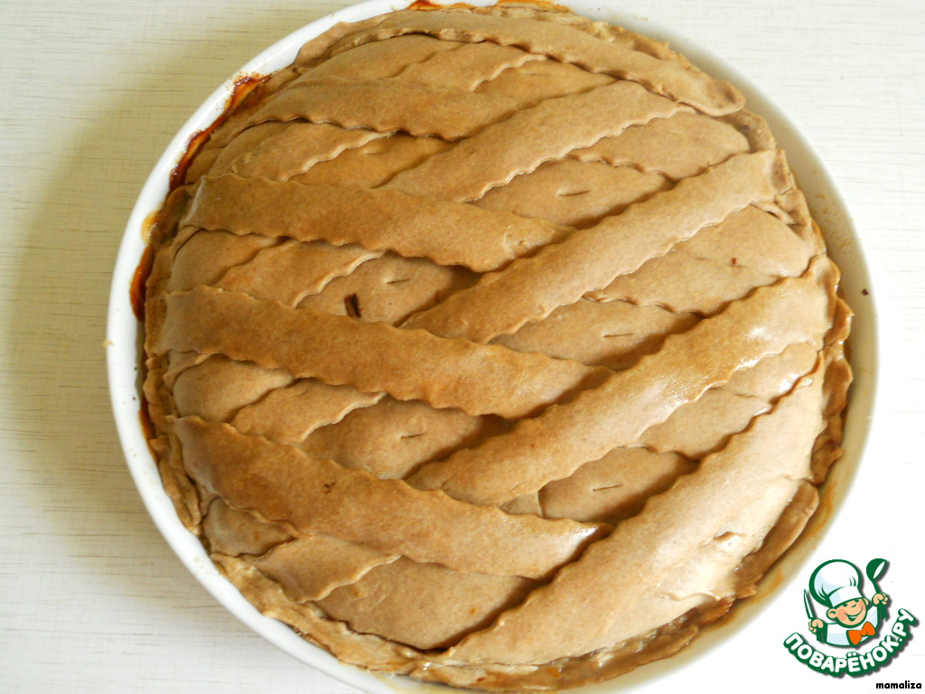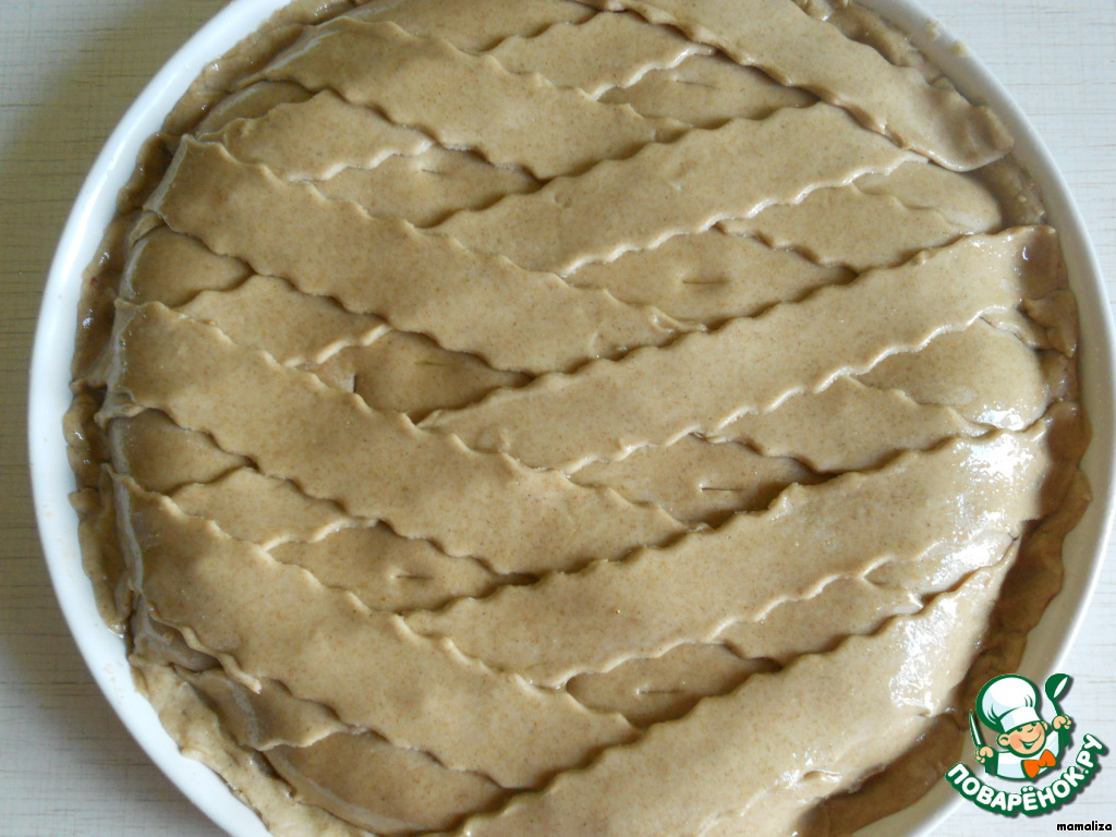 Большую часть раскатать по диаметру формы и накрыть сверху пирог, тщательно прижимая края и обрезая лишнее. Оставшееся тесто тонко раскатать, вырезать полоски и украсить пирог. В промежутках между полосками сделать несколько отверстий для выходящего пара. Верх пирога смазать оставшимся жиром.