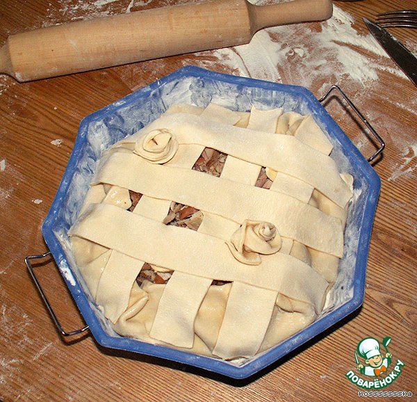Смазываем форму и выстилаем ее пластинкой теста Осатками теста выстилаем решетку, чтобы оставались открытые места.