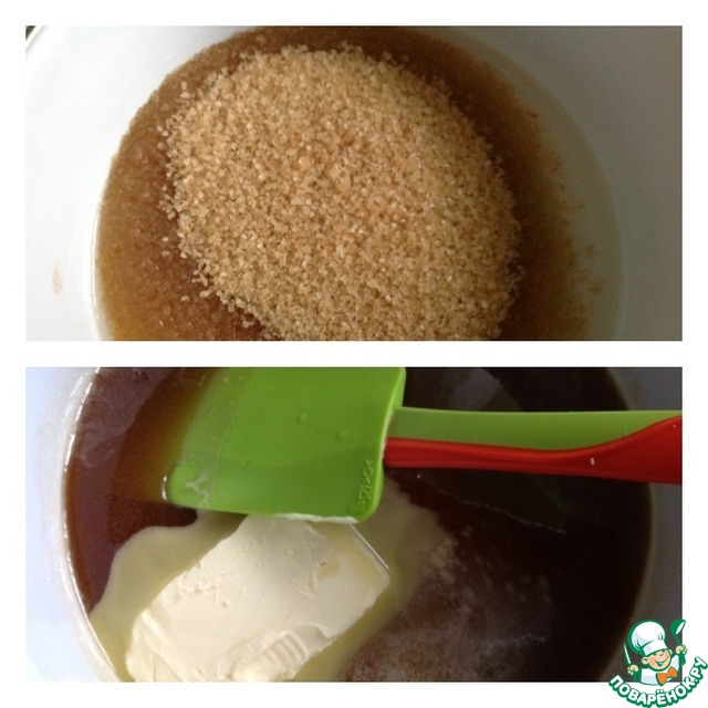 В ковшик выливаем 50 мл воды и добавляем 2 стак сахара. Варим карамель на медленном огне 7 мин. Добавляем 50 гр масла и коньяк. Варим еще минут 5.