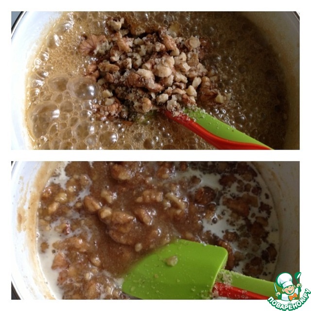 Добавляем грецким орех, измельченный не очень крупно и не мелко. Средними кусочками. Постоянно помешивая, вливаем сливки, и варим еще 3 мин.