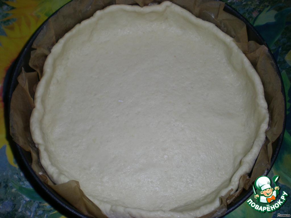 Форму застелить бумагой для выпечки, смазать маслом. Тесто раскатать так, чтобы потом получились бортики. Я подсыпала чуть муки. Скалкой аккуратно перенести в форму.