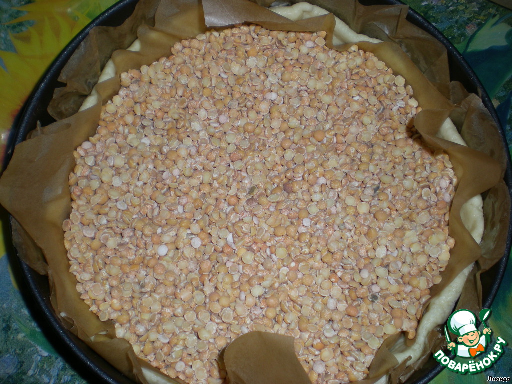Сверху положить бумагу и насыпать в нее горох(фасоль). Выпекать при 200* 20 мин.