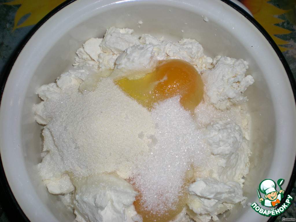 Для начинки творог смешать блендером с яйцами, сахаром, манкой.
