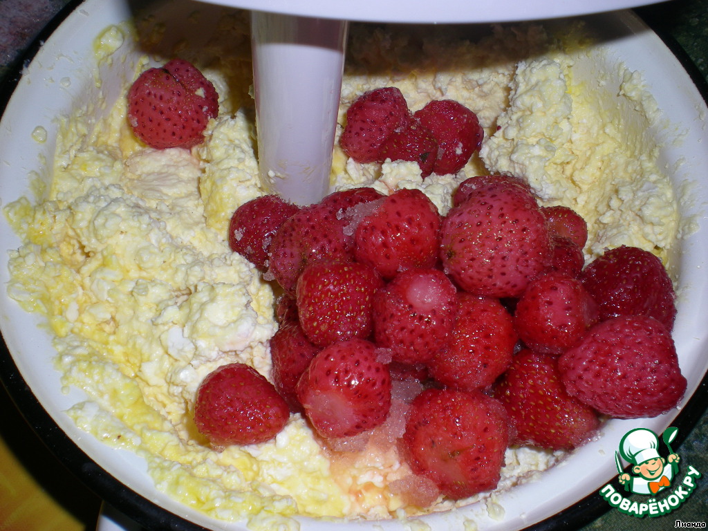 Добавить клубнику. Немного оставьте. Я сильно не измельчала ее.