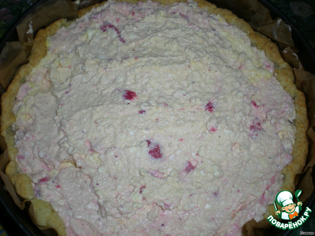 Тесто достаньте из духовки, уберите горох. Аккуратно разместите творог в "корзинке" и разровняйте его. Поставьте пирог еще минут на 30 в духовку.