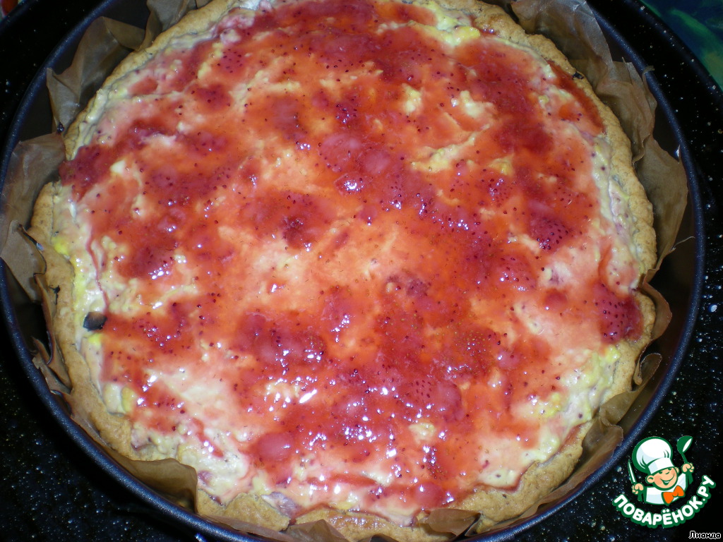 Когда пирог будет почти готов (я проверяю лучинкой), полейте его оставшейся растертой клубникой.