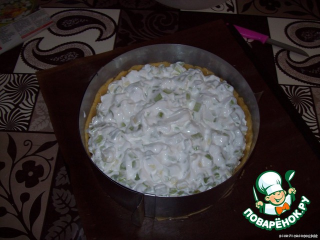 Теперь вытаскиваем из холодильника нашу форму с тестом и выкладываем начинку.