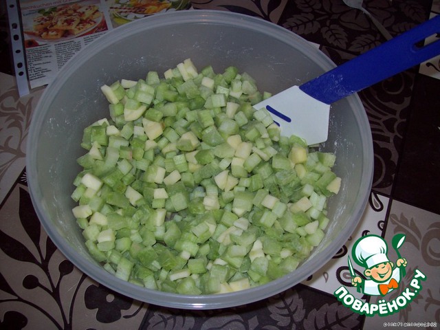 Ревень помыть, почистить, нарезать мелко - примерно полсантиметра - квадратиками.