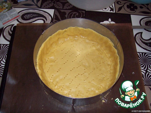 Большую часть теста разровнять на дне формы, из остального теста сделать бортик примерно 4,5 см. Тесто наколоть вилкой и поставить в холодильник.