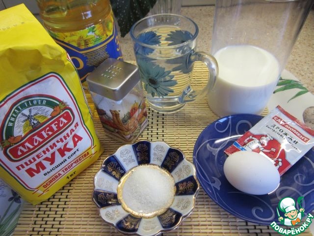 Молоко+вода+яйцо+сол ь+раст. масло+опара+мука (постепенно)=замесить тесто