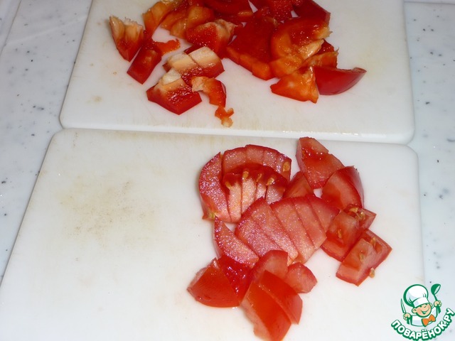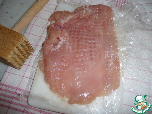 Филе мелко нарезать, посолить, поперчить. Завернуть в пленку и оставить минут на 20.