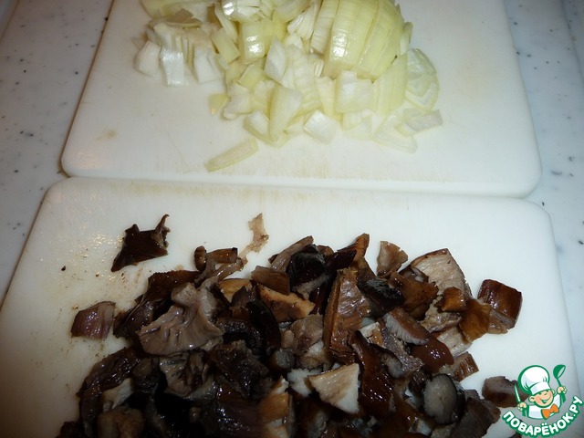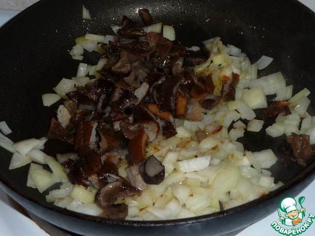 Лук обжарить в этой же сковороде, добавить грибы, посолить.