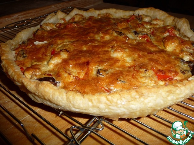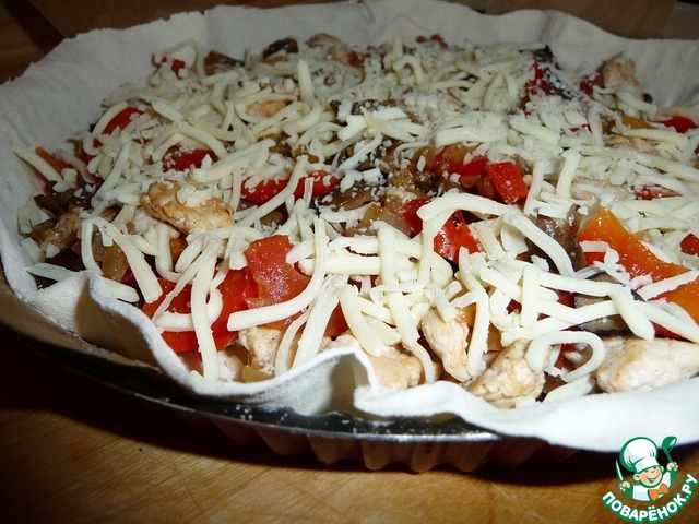 Выложить начинку на тесто, посыпать сыром (соль перец по вкусу).