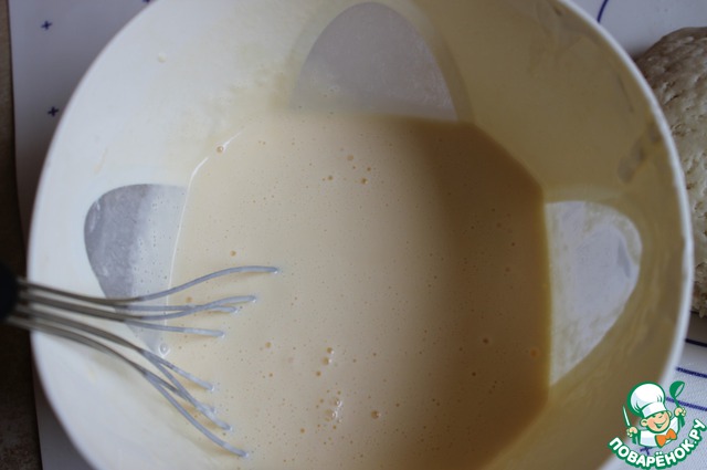 Для заливки смешаем 250гр сметаны, ванильный сахар, 50гр сахара, 2 яйца и 1 белок, и ложку крахмала. Желток оставим для обмазки пирога.