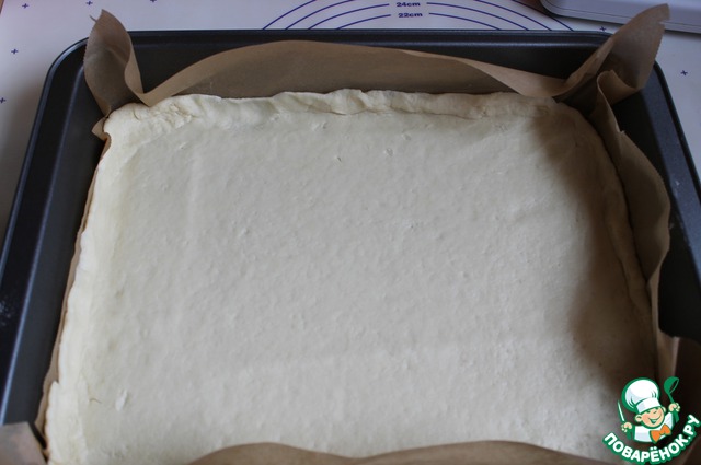 Берем глубокую форму. У меня 30на 38 см. застилаем ее бумагой. раскатываем 2/3 теста и выкладываем его в форму. Можно просто раскатать тесто прямо на бумаге и перенести его вместе с бумагой на лист. Бока завернем.