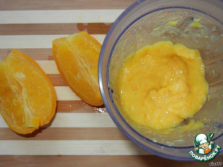 Итак, приступим. Для начала нужно сварить апельсин. Да-да, Вы не ослышались, именно сварить. Варим апельсин в большом количестве воды около 1,5 часа на небольшом огне. По истечении времени апельсин охлаждаем, разрезаем и, если нужно, удаляем косточки. Затем мякоть вместе с кожурой измельчаем при помощи блендера в пюре.