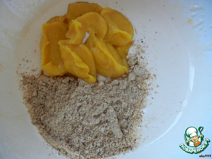 К желткам добавляем апельсиновое пюре и молотый миндаль, перемешиваем и выливаем шоколад. Еще раз хорошенько перемешиваем. Яичные белки взбиваем в крепкую пену, добавим сахар и взбиваем до образования плотной массы.
