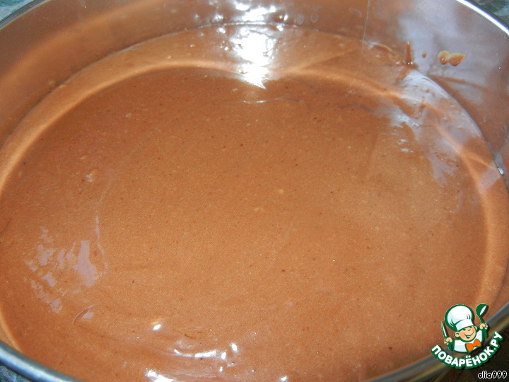 Шоколадную массу смешиваем с белками и выливаем в разъемную форму 21-22см, застеленную бумагой.