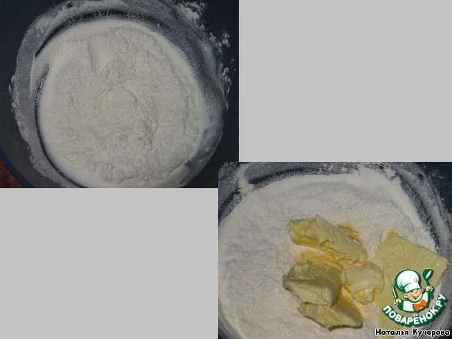 В миске смешать муку с содой и солью. Добавить масло и хорошо смешать его с мукой, растирая пальцами до мелкой крошки. Комочков быть не должно.