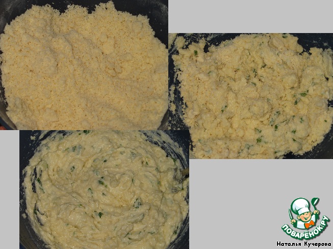 В другой миске смешать хорошо размятый картофель, яйцо, молоко и петрушку. Хорошо перемешать все. Далее смешать картофельную массу с мучной. Должна получиться очень хорошо перемешанная, липкая масса.
