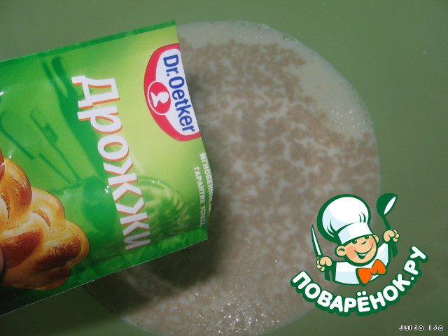 Тесто делаем опарным способом. Для опары, в тёплое молоко добавить дрожжи (у меня сухие, но можно использовать свежие, на это количество - 40гр.).