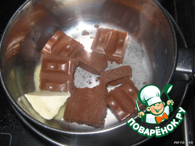 И выпекаем в, разогретой до 190 градусов духовке до готовности. У меня пеклось минут 40. Тем временем, на водяной бане растапливаем шоколад с кусочком масла. У меня был пористый, но лучше такой не использовать, так как он потом образует крупинки.