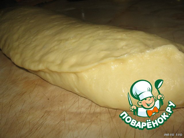 Отрываем от теста кусок (половину). Раскатываем его на столе (мукой присыпать уже не нужно, нужно смазать стол и руки растительным маслом), в прямоугольный пласт, толщиной ~0,5см.