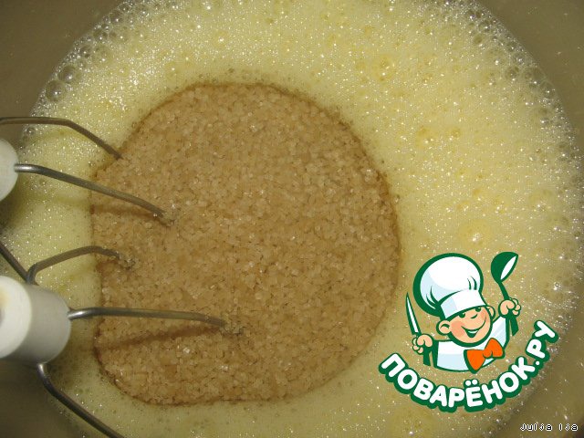 Яйца (2шт.) взбиваем с сахаром и щепоткой соли. Сахар у меня коричневый, но можно и обычный.