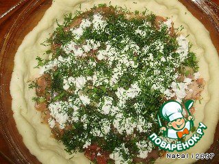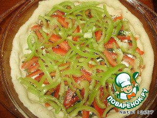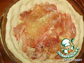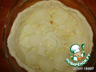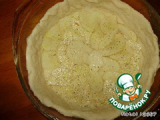 Часть теста раскатать и выложить в форму для запекания, сверху выкладываем нарезанный на тонкие колечки картофель. Солим и перчим.